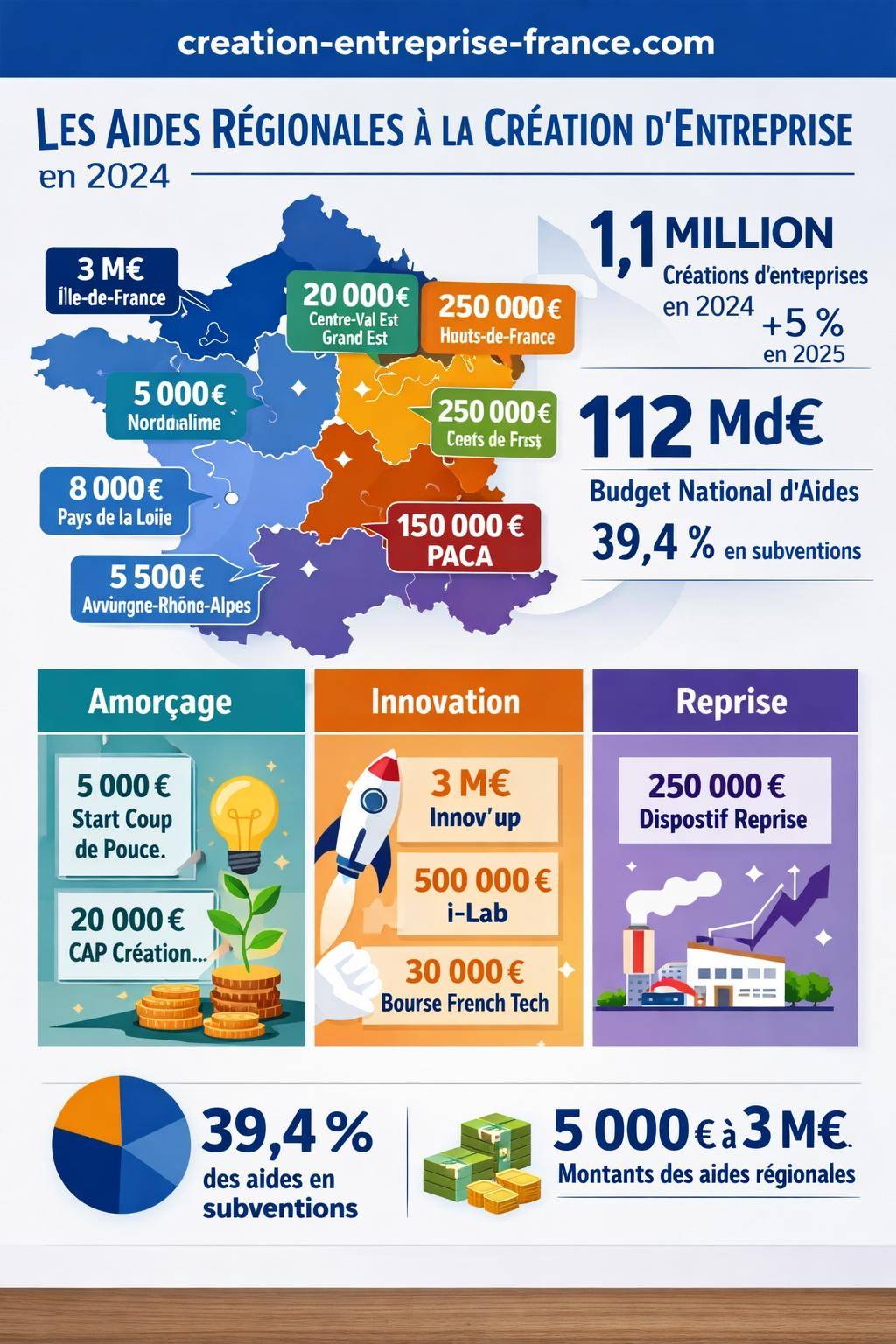 | Aides régionales à la création | Région | Subventions, primes, avances remboursables, accompagnement | Créateurs, repreneurs, TPE / PME locales |