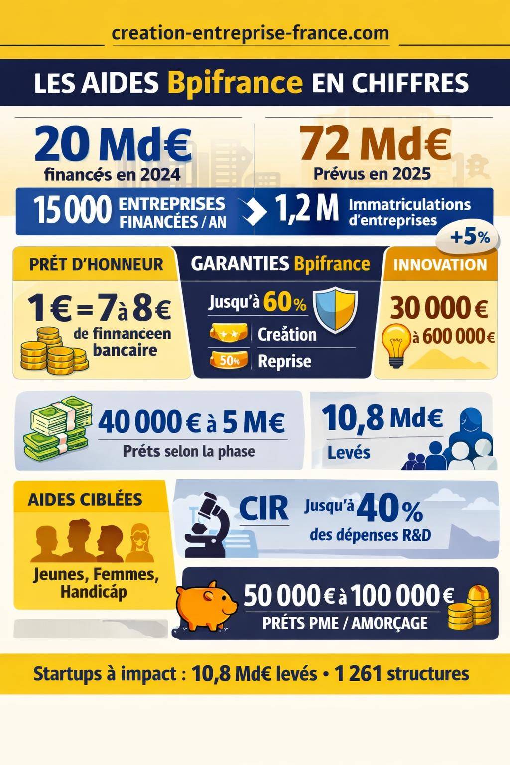 La dynamique se renforce encore en 2025 : 72 milliards d’euros sont annoncés pour soutenir l’économie, avec 1,2 million d’entreprises immatriculées et une progression des créations d’environ 5 %. Dans ce contexte, Bpifrance soutient également l’innovation de rupture et l’impact : les startups à impact ont levé 10,8 milliards d’euros et représentent déjà 7 % des emplois créés, avec 1 261 structures recensées.