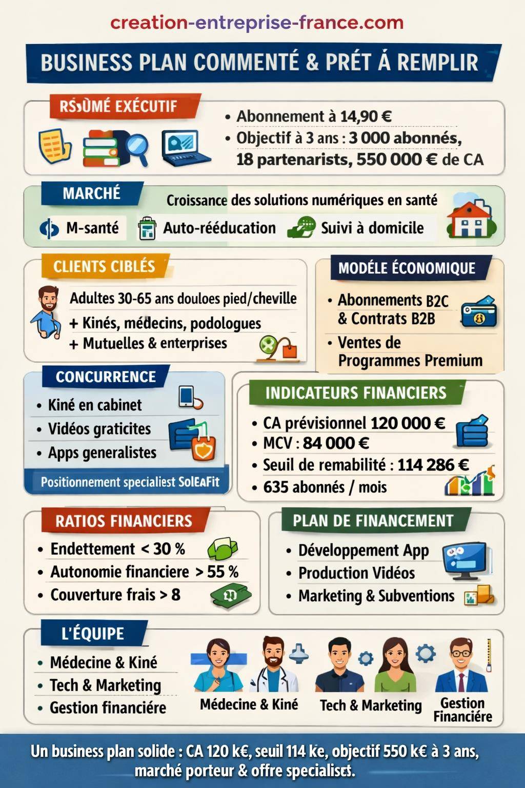 | Contenu principal | Résumé du projet, étude de marché, stratégie commerciale, modèle économique, prévisions financières. |