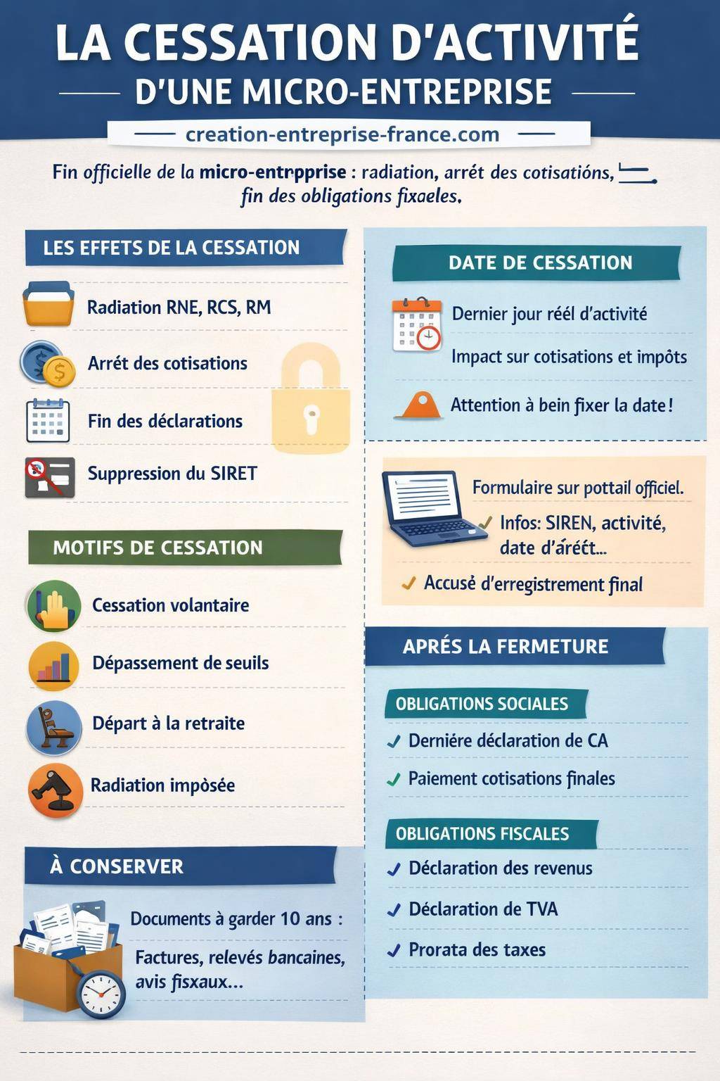 | Situation juridique | Radiation du statut micro‑entreprise, suppression du SIRET lié à l’activité | Vérifier la mention de cessation sur les registres et conserver l’accusé de déclaration |