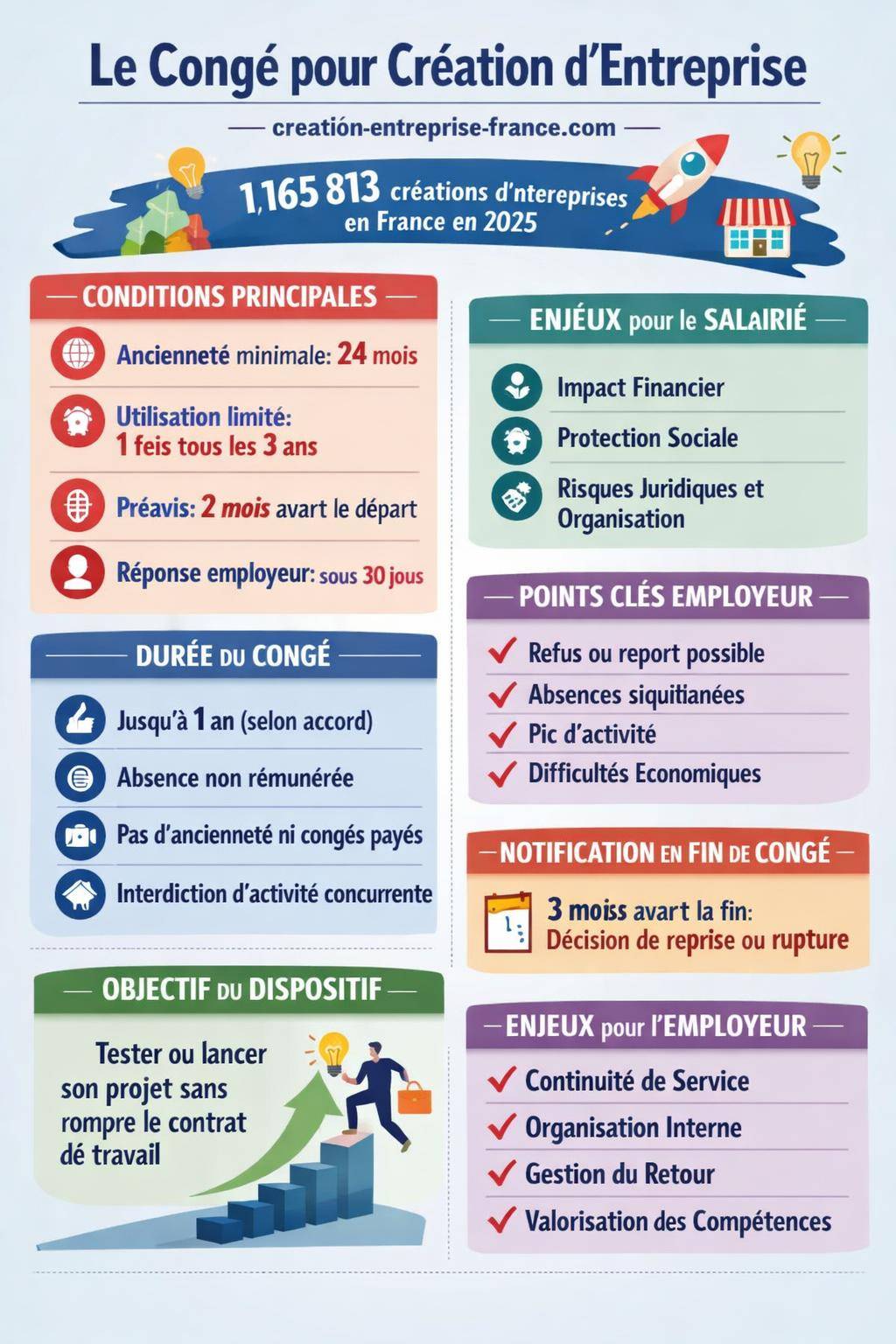 | Objectif du congé | Permet au salarié de se consacrer temporairement à la création ou reprise d’une entreprise 🚀 |