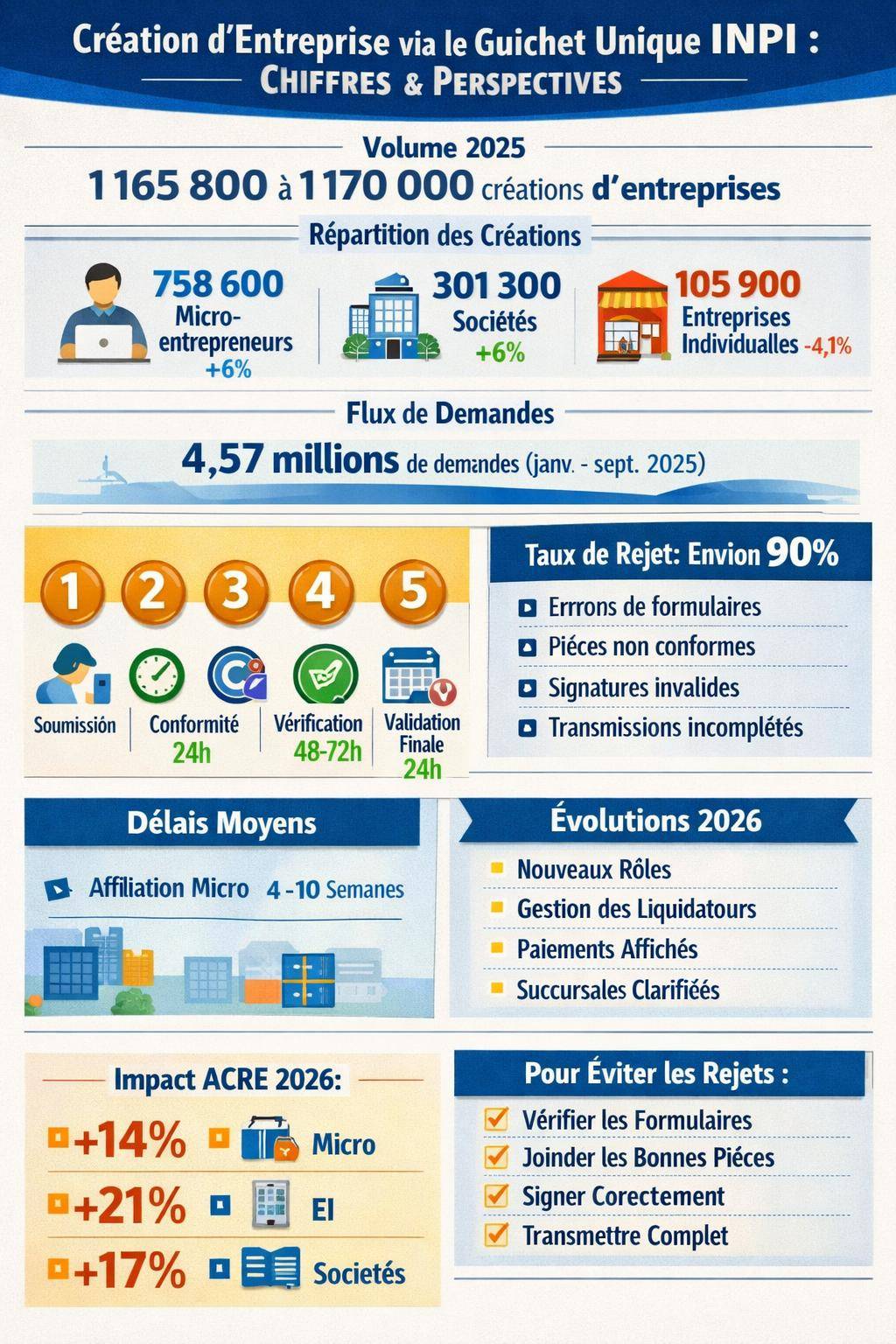 Ce guide détaille les étapes concrètes à suivre sur le guichet unique, les délais réels, les blocages possibles et l’impact des nouvelles règles 2026 comme la réforme de l’ACRE. Il présente aussi des stratégies pratiques pour sécuriser votre dossier dès la première tentative et limiter les rejets qui touchent aujourd’hui une majorité de formalités.
