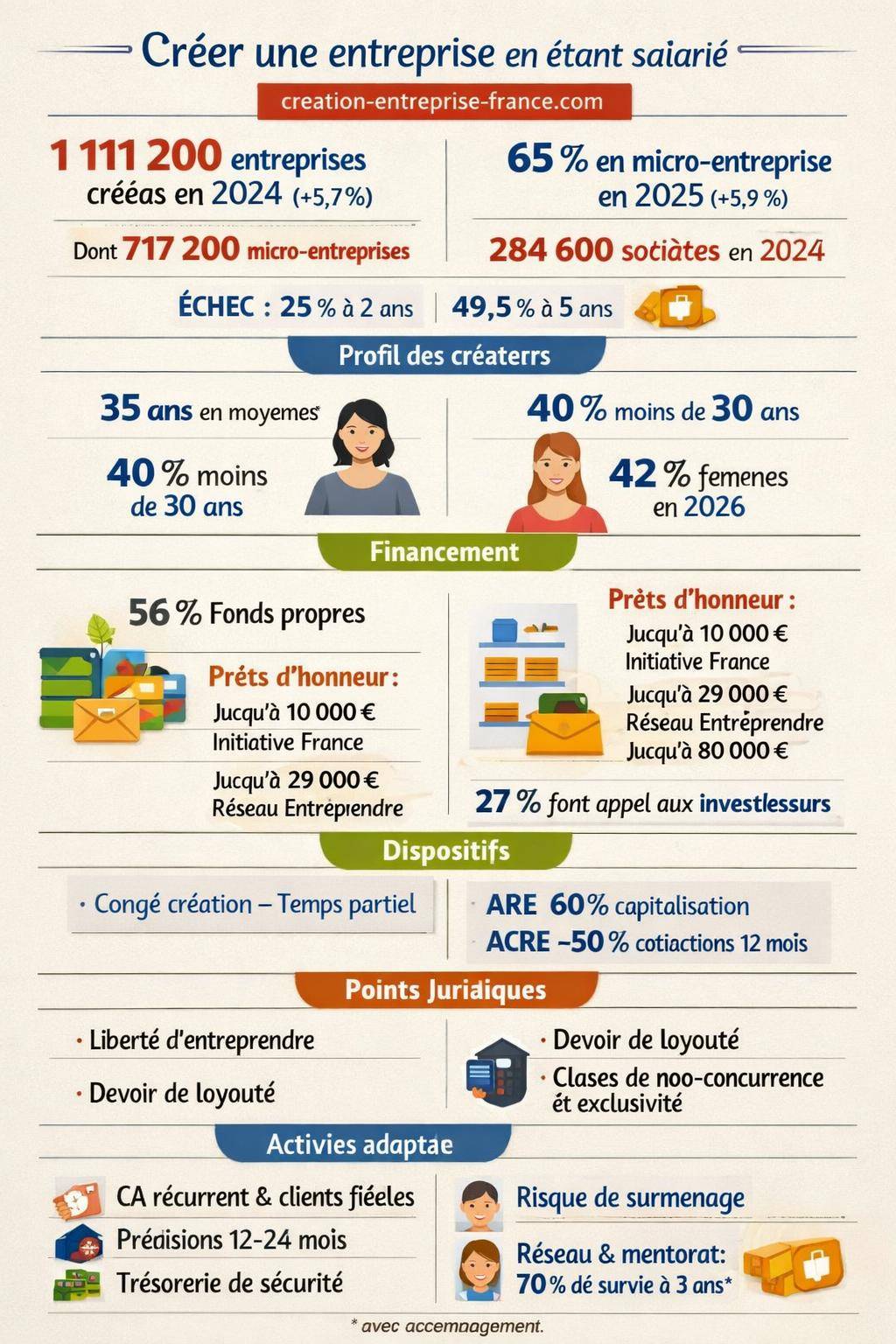En parallèle, la dynamique économique actuelle montre que de nombreux porteurs de projet font ce choix. En 2024, plus de 1 111 200 entreprises ont vu le jour en France, avec une progression de 5,7 % par rapport à 2023. Une partie significative correspond à des créations en parallèle d’une activité salariée, notamment sous le régime de la micro-entreprise.