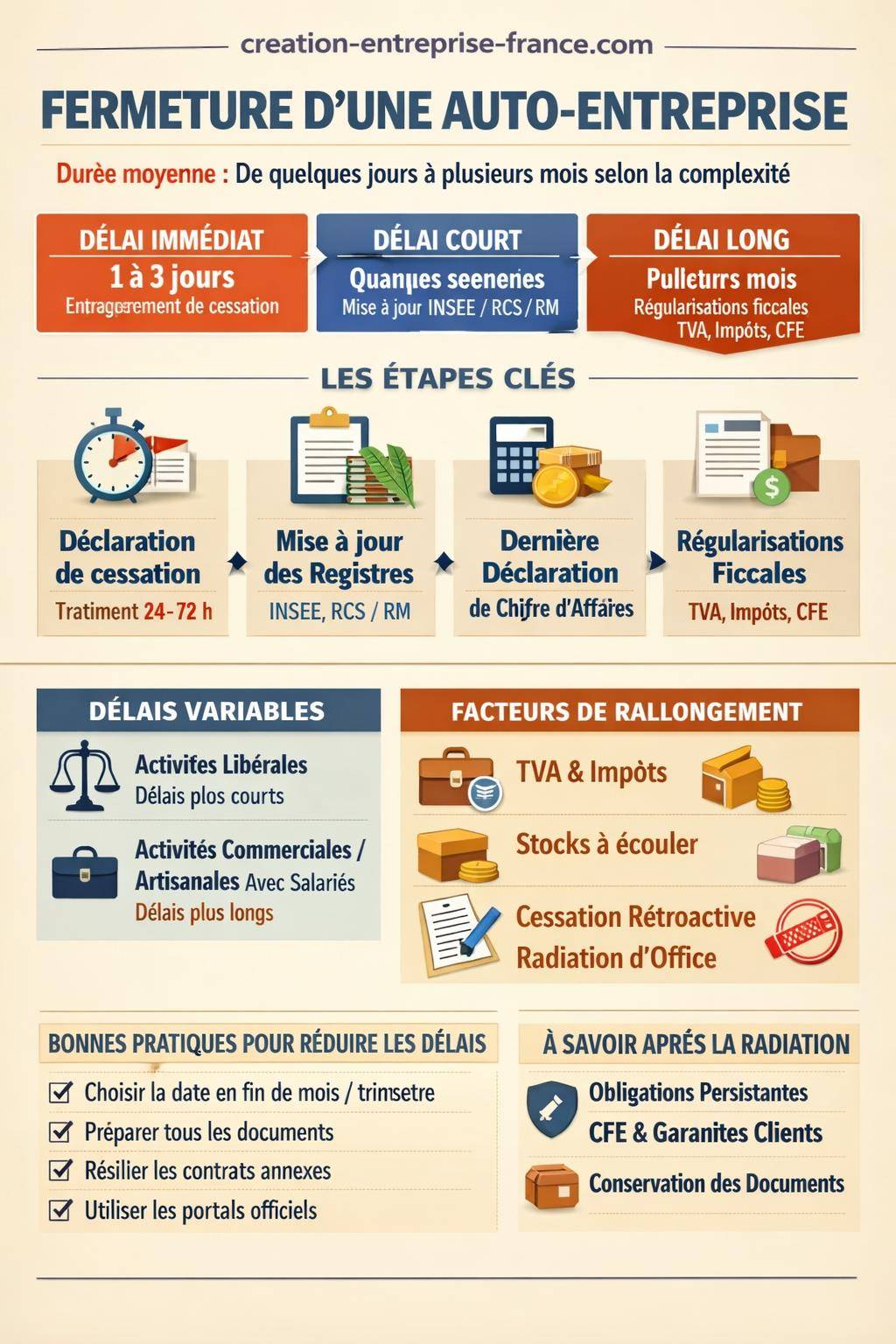 La fermeture d’une auto-entreprise suit une chronologie précise. Le délai global ne correspond pas seulement au traitement du formulaire de cessation, mais à l’ensemble du cycle de clôture : déclaration de cessation, régularisations fiscales, régularisations sociales et mise à jour des registres officiels.