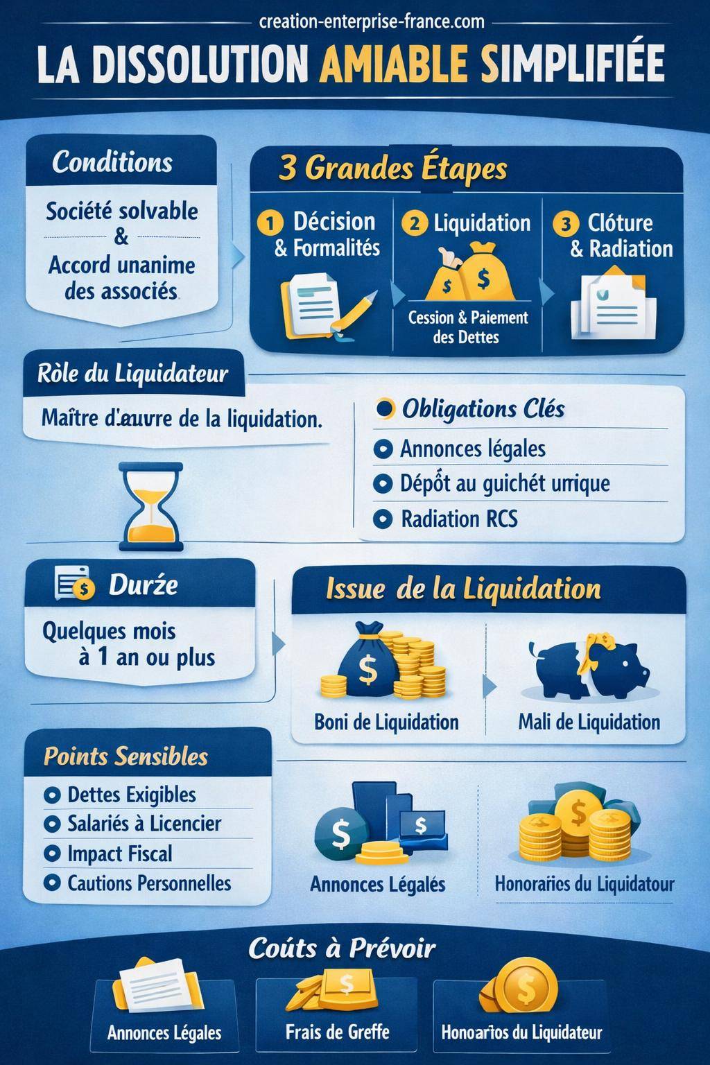 | Dissolution amiable simplifiée | Mettre fin à l’activité de manière contrôlée et ordonnée | Associés (décision d’AG) | Entreprise solvable, apurement intégral du passif | Liquidation amiable, répartition du boni ou constatation du mali, radiation |