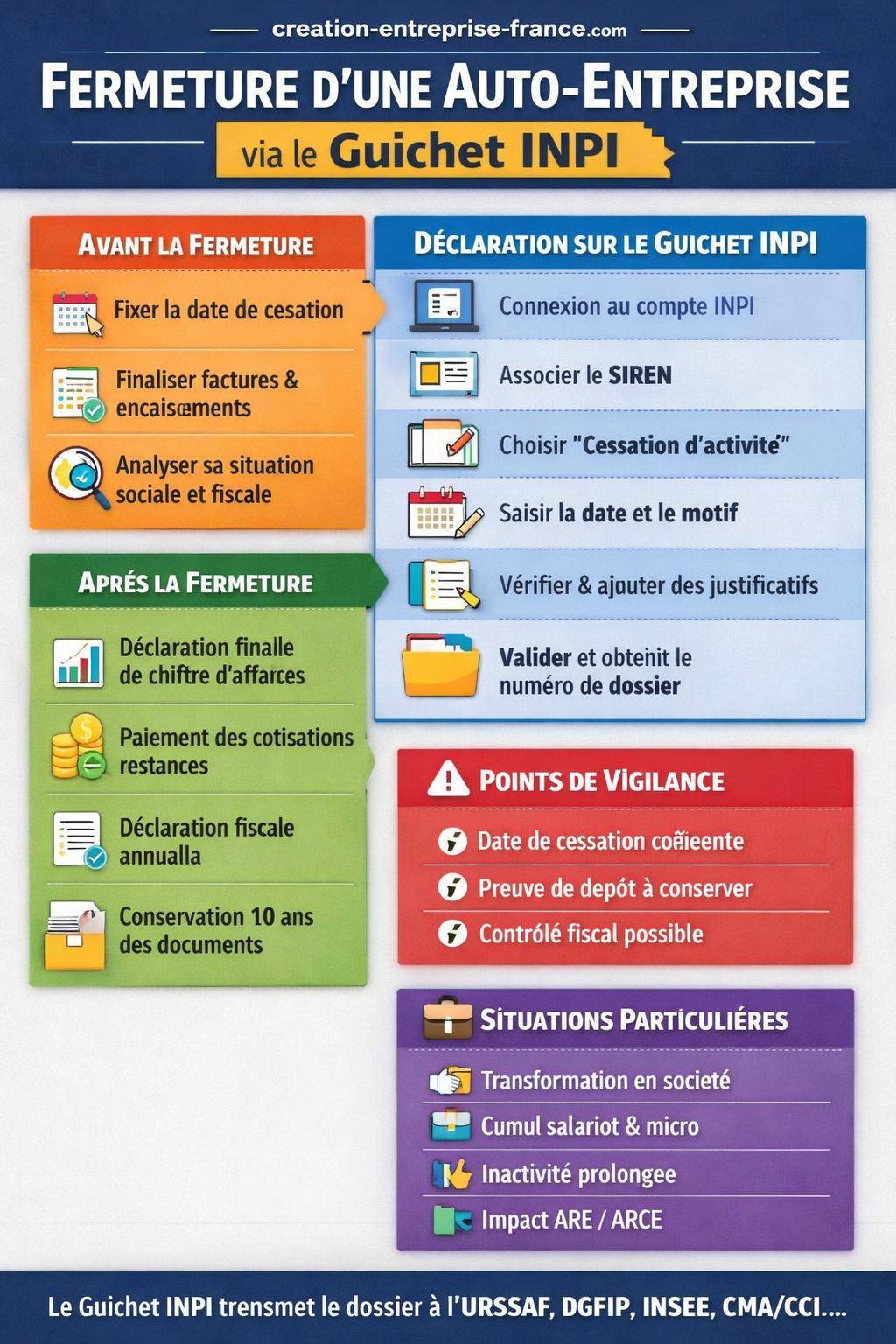 | Remplissage du formulaire de cessation | Saisir date, motif et données de l’entreprise | Auto-entrepreneur | Relire attentivement avant validation et joindre les justificatifs nécessaires |