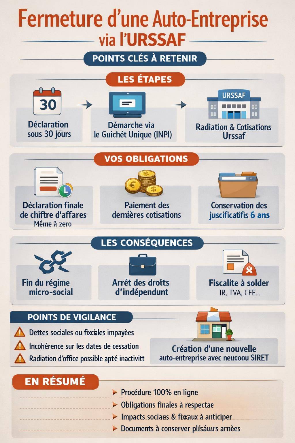 | Procédure | La fermeture se fait en ligne depuis le site de l’URSSAF en quelques étapes simples. |