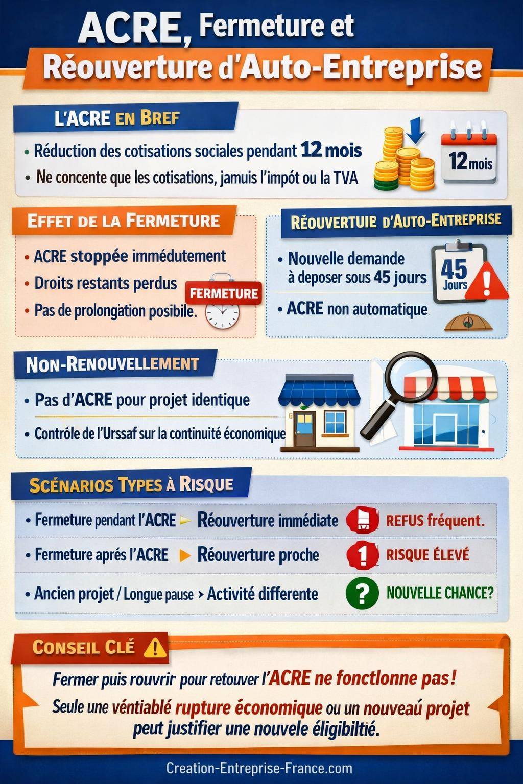 | Fermeture après ACRE + réouverture proche | ACRE déjà utilisée, nouvelle demande rarement admise | Considération d’un même projet fractionné |