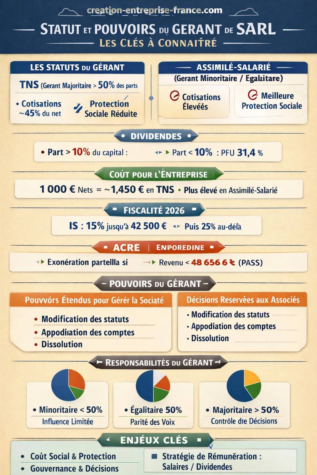 Le gérant associé majoritaire concentre un double pouvoir : pouvoir de gestion quotidienne comme gérant et contrôle capitalistique à travers la majorité des parts sociales. Sur le plan social, il relève du régime TNS.