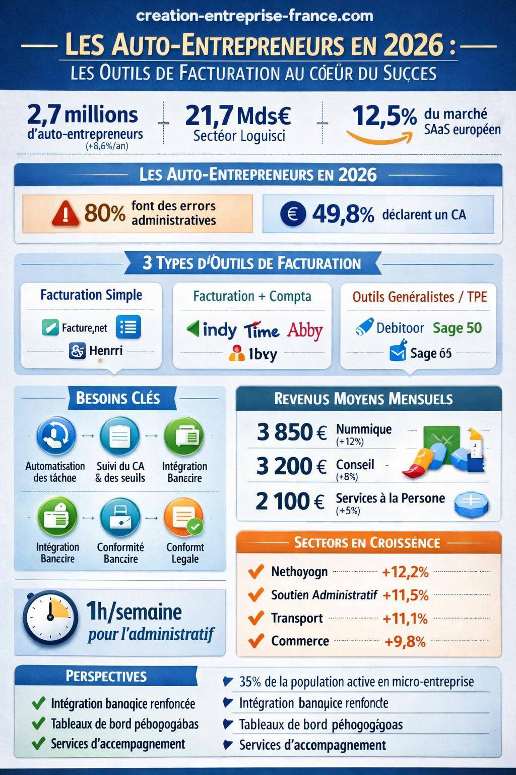 Ce flou commercial contraste avec une réalité très concrète : les erreurs administratives restent massives. 80 % des nouveaux auto‑entrepreneurs commettent des erreurs dans leurs démarches et seule une personne sur deux (49,8 %) déclare réellement un chiffre d’affaires. Le logiciel de facturation prend alors une dimension stratégique : limiter les erreurs, gagner du temps, suivre l’évolution du chiffre d’affaires, anticiper les seuils et structurer la gestion quotidienne.