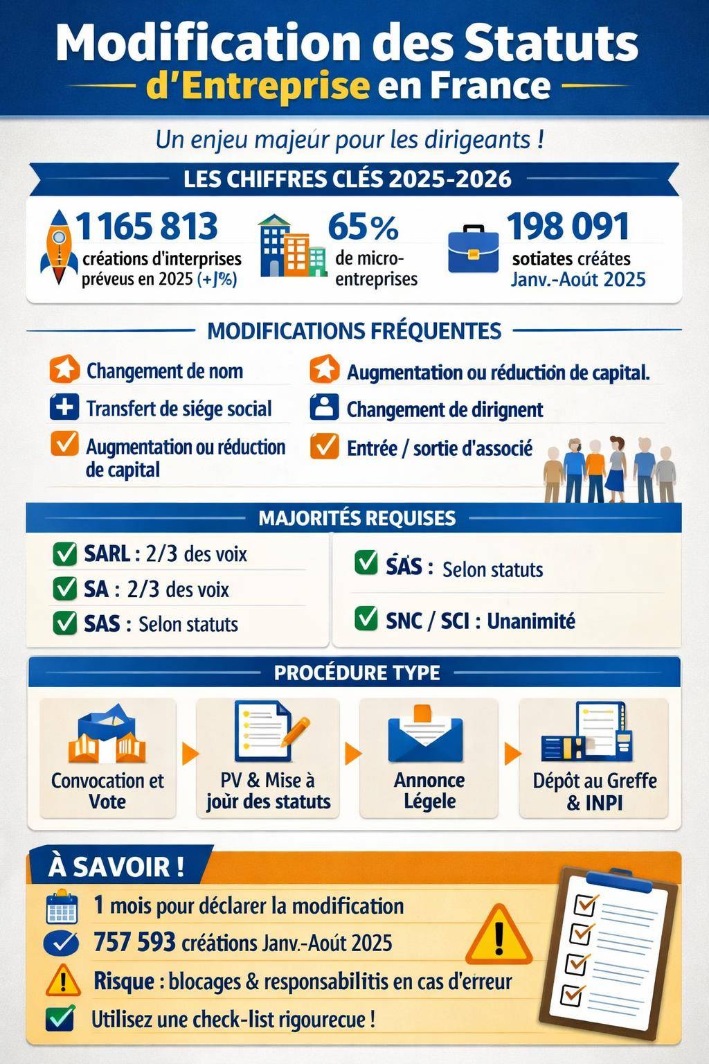 En France, la dynamique de création d’entreprises reste soutenue : plus de 1 165 813 créations prévues en 2025, avec une croissance d’environ 5 % par rapport à 2024. Les microentreprises représentent près de 65 % des créations, tandis que les sociétés (SAS, SARL, SCI, SA…) continuent de se développer. Cette croissance génère un volume élevé de modifications statutaires : évolution de projets, pivot d’activité, entrée d’investisseurs, changements de siège ou de direction.