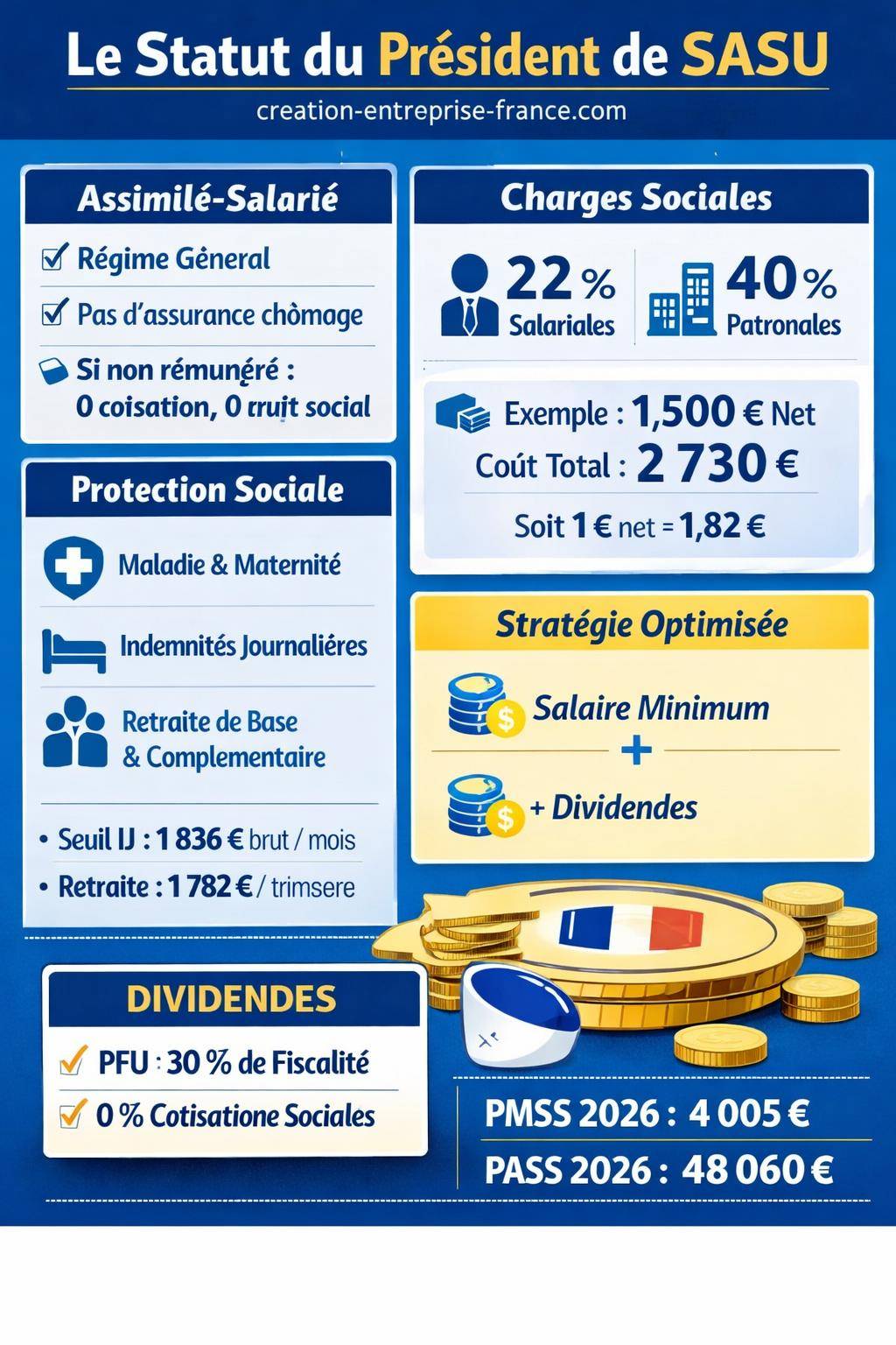 | Salaire du président | Protection sociale complète, cotisations retraite fortes | Coût élevé en charges sociales | Présidents souhaitant une protection maximale |
