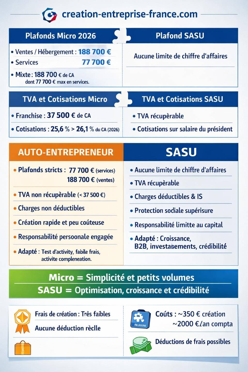 | Critère | Auto-entrepreneur 2026 | SASU 2026 |
