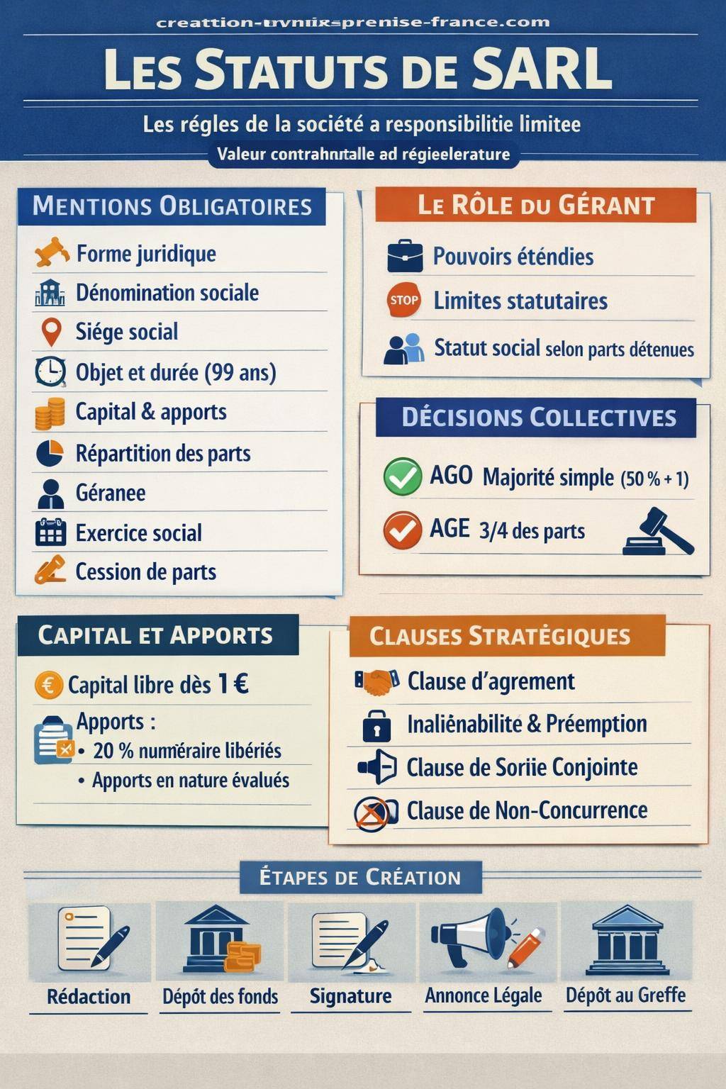 | Mentions obligatoires | Objet social, capital, gérance, répartition des parts, siège, durée, règles de décision. |